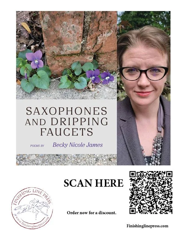 Becky Nicole James is the author of Saxophones and Dripping Faucets, a poetry chapbook now available for pre-order from Finishing Line Press. Her honors include a Pushcart Prize nomination, two Honorable Mentions in the Lena M. Shull Book Award, The Fieldstone Review poetry prize, and a Best of the Net nomination. Becky’s poetry, fiction, and nonfiction appear in many publications including Bellevue Literary Review, MARGIE, Best of Birmingham Arts Journal, and Moon City Review. She is currently working on poetry collections, a novel, and a young adult fantasy series. Becky works as an English instructor, tutor, and editor in Fayetteville, North Carolina, where she lives with her husband, son, and orange cat.